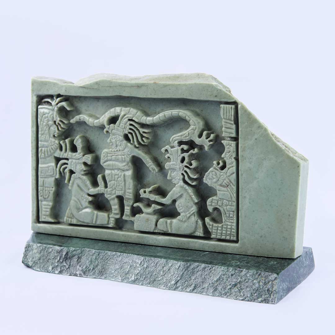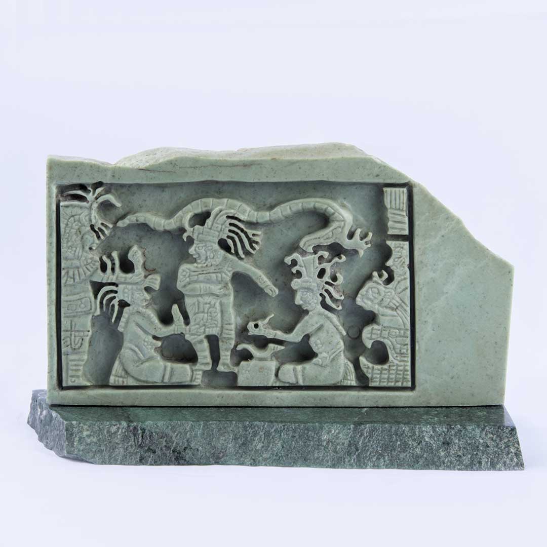 This green jade artwork represents the worldviews and spiritual traditions of the creation of the world, inspired by the stories of the Popol Vuh. In particular, it reflects the adventures of the twin gods Hunahpú and Ixbalanqué, heroes of the creation of the earth. Through their challenges, the twins established the balance between heaven and earth, and between the gods and humans. The green jade, a symbol of vitality and fertility, is used here to capture the essence of these creator gods and their relationship with nature.